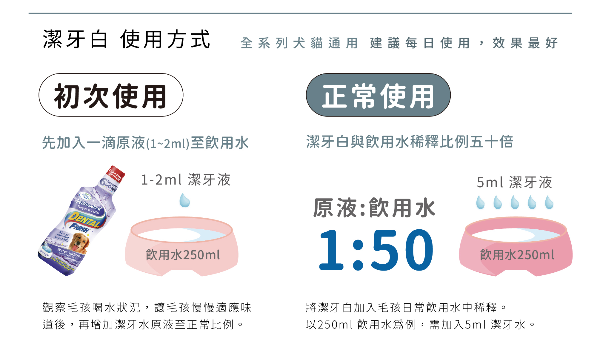 初次使用可以先少量添加(1-2滴)讓毛孩適應,再慢慢調回建議的正常比例。