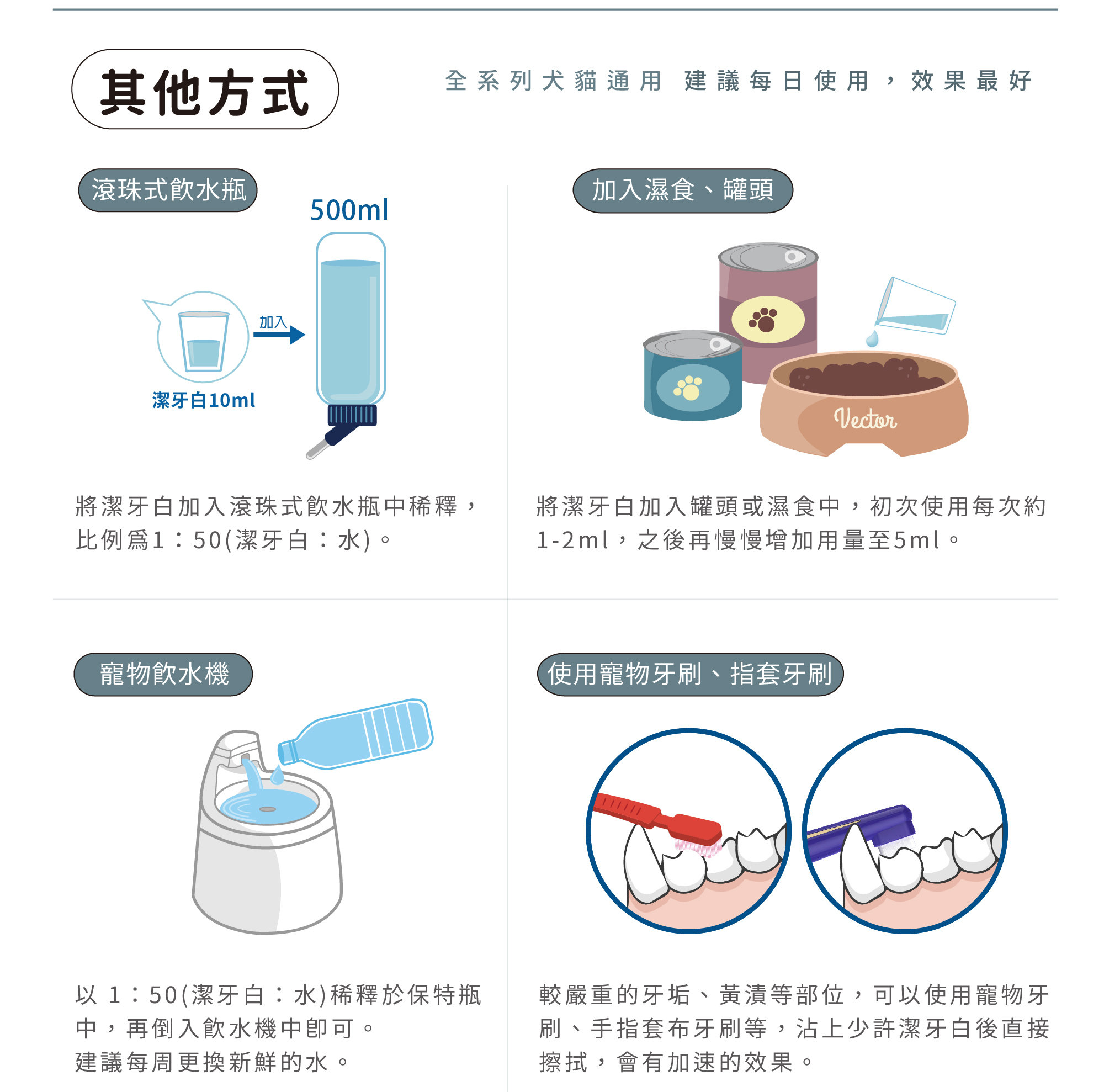 如果毛小孩不愛喝水,也可加入罐頭,濕食,湯包一起食用。或是使用口腔潔牙噴劑。