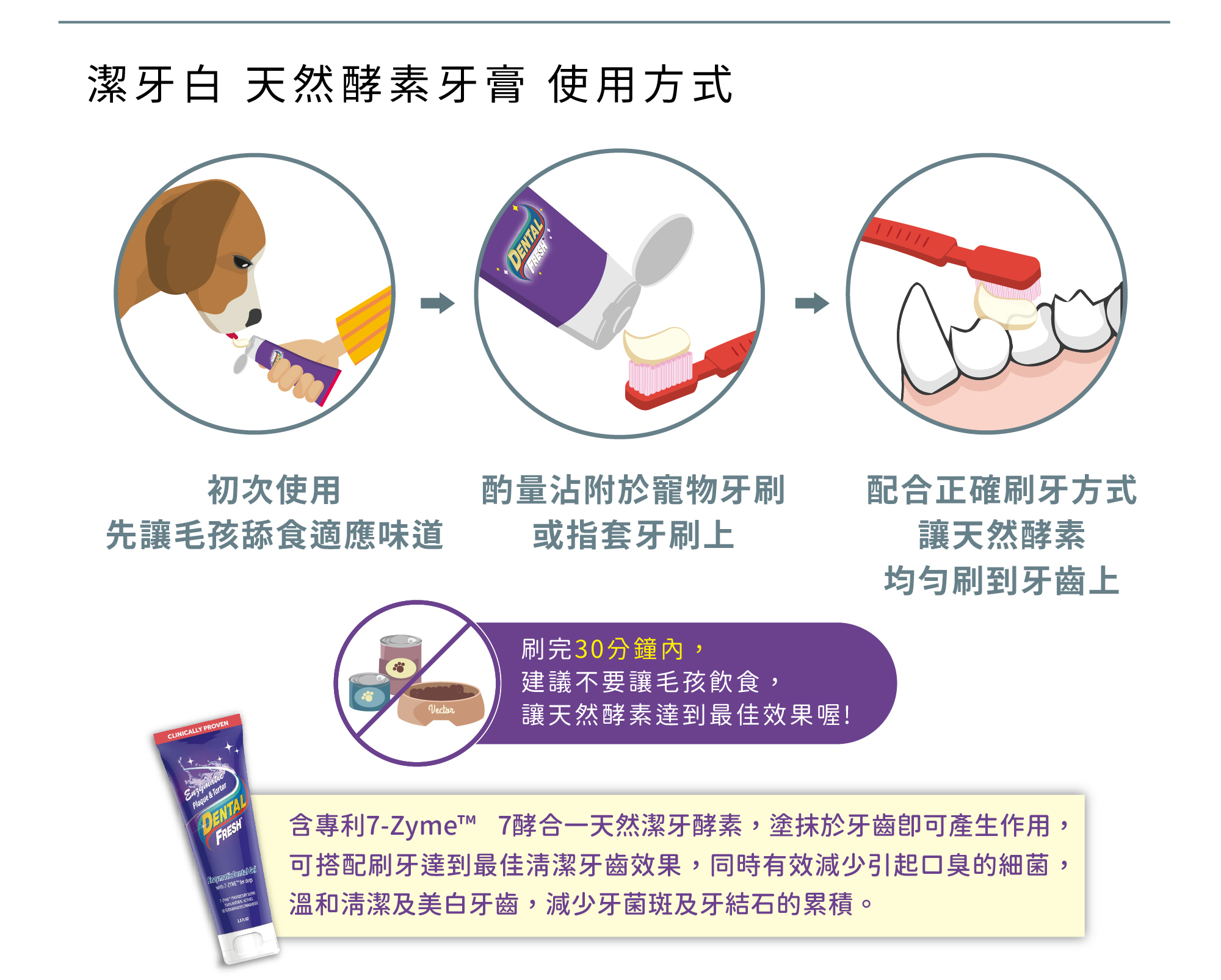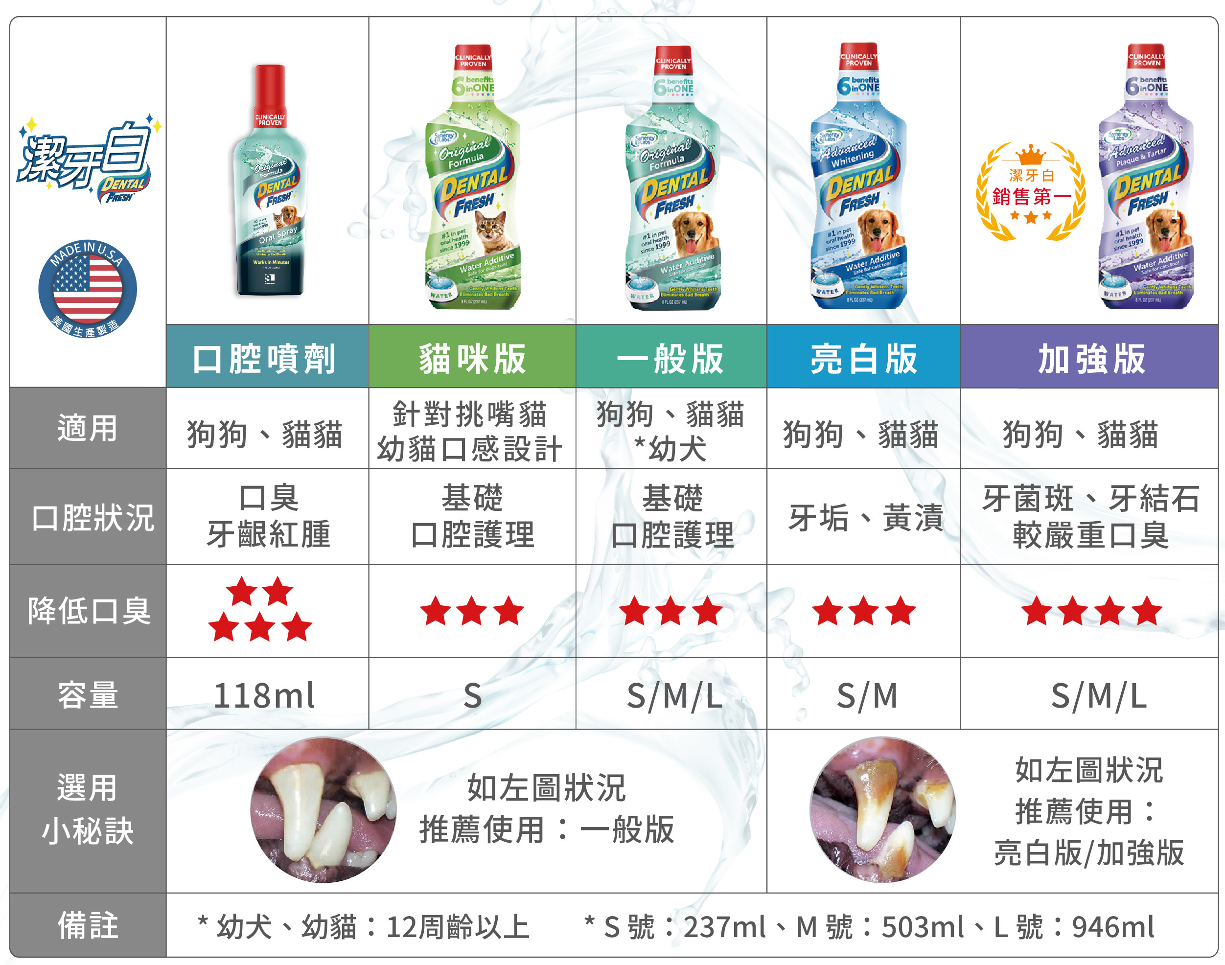 A.潔牙白(DENTAL FRESH) 1999年在美國上市,是美國Synergylabs公司配合獸醫臨床驗證研發的世界第一瓶寵物潔牙水,針對不愛刷牙狗狗&貓咪設計的全效口腔清潔護理產品,暢銷全球超過20年,是全球最暢銷寵物潔牙水,專利可食用的免刷潔牙配方,只需每天加潔牙白到毛孩的飲水中一起喝,讓清潔口腔變得好輕鬆。
