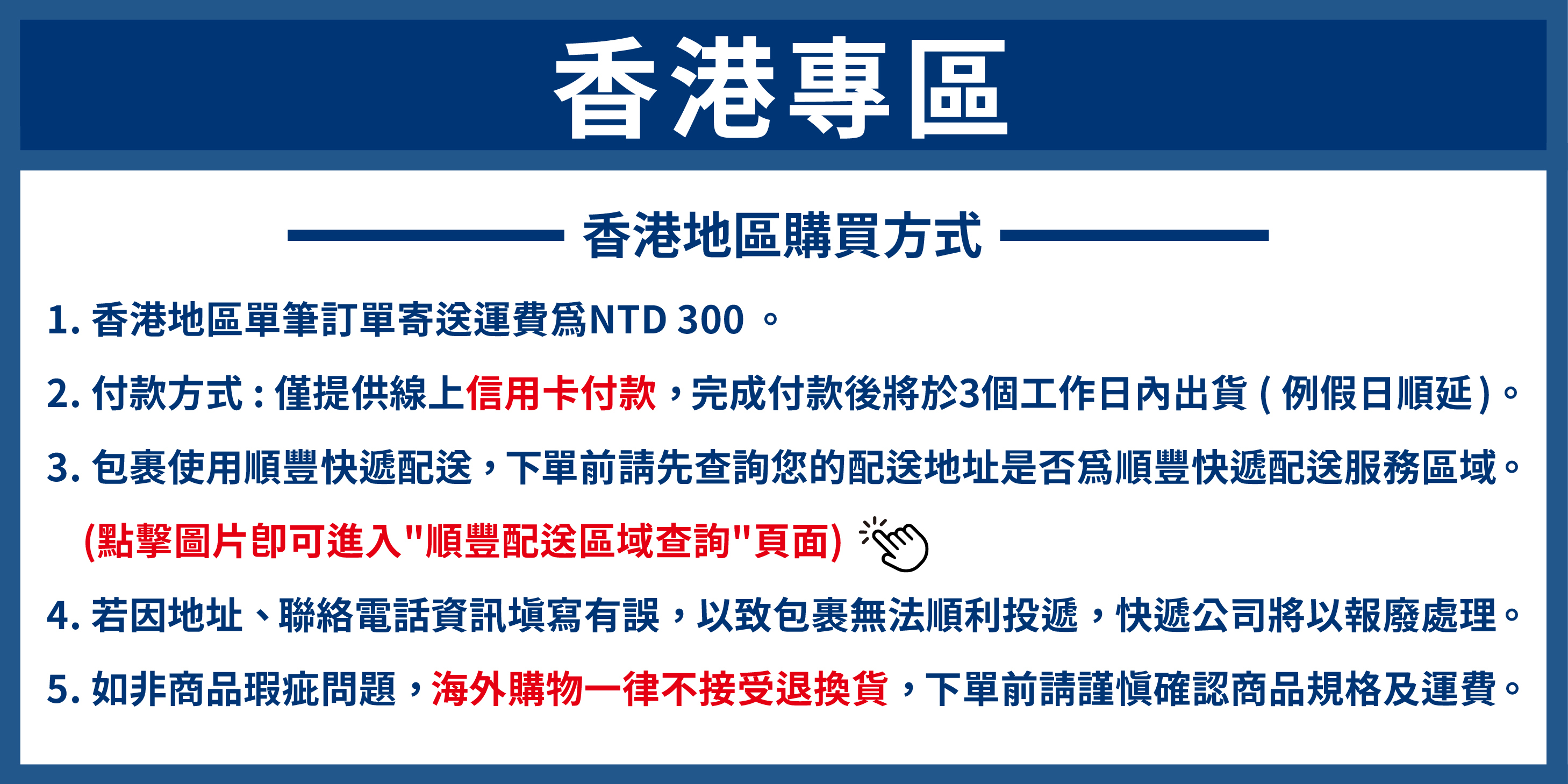 1. 香港地區單筆訂單運費為NTD 300,香港地區使用順豐快遞提供商品配送服務。