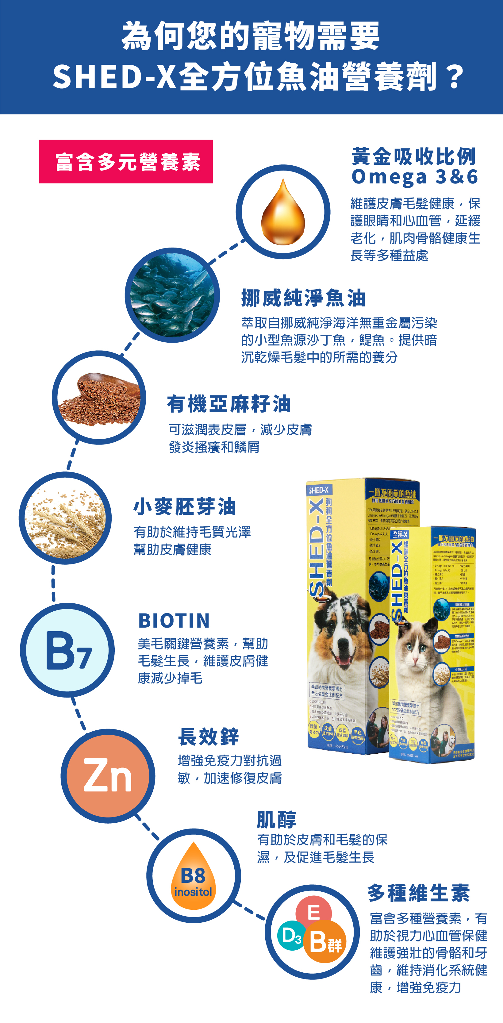 『SHED-X 全方位魚油營養劑』是美國動物營養學博士專為狗狗貓咪營養需求研製的日常保健魚油營養劑,100%全天然營養配方,可以維護皮膚健康,毛髮亮麗,提升抵抗力,眼睛心血管保健,營養均衡,幫助骨骼發展,延緩老化等多元益處。