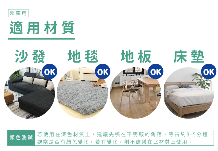 2. 深色材質、易褪色材質請先在不明顯角落做顏色測試,若使用後有變色,不建議使用於該材質上。