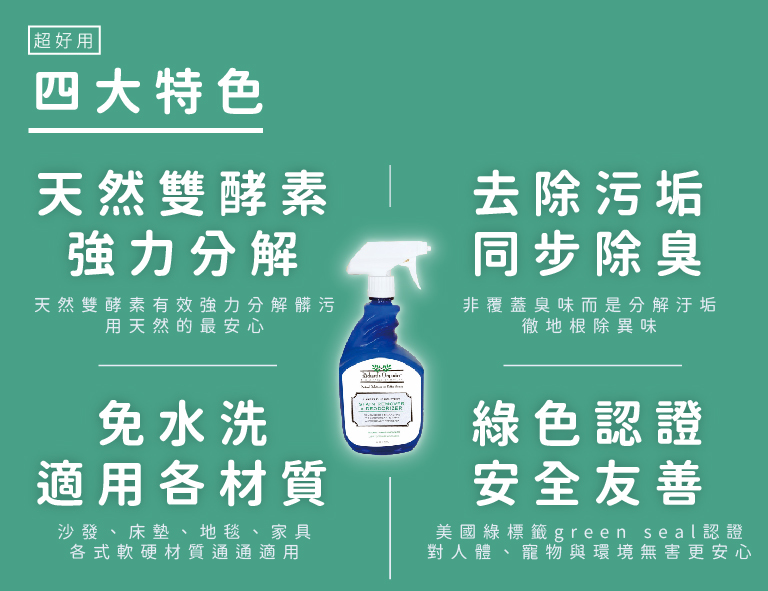 強力天然超高濃度雙效酵素可迅速分解去除污漬,污垢及去除寵物便溺主要的惡臭化合物,如硫化氫(便便臭味),氨氣(尿騷味),二甲胺和三甲胺(魚腥味)等臭味,清潔+除臭雙效合一。